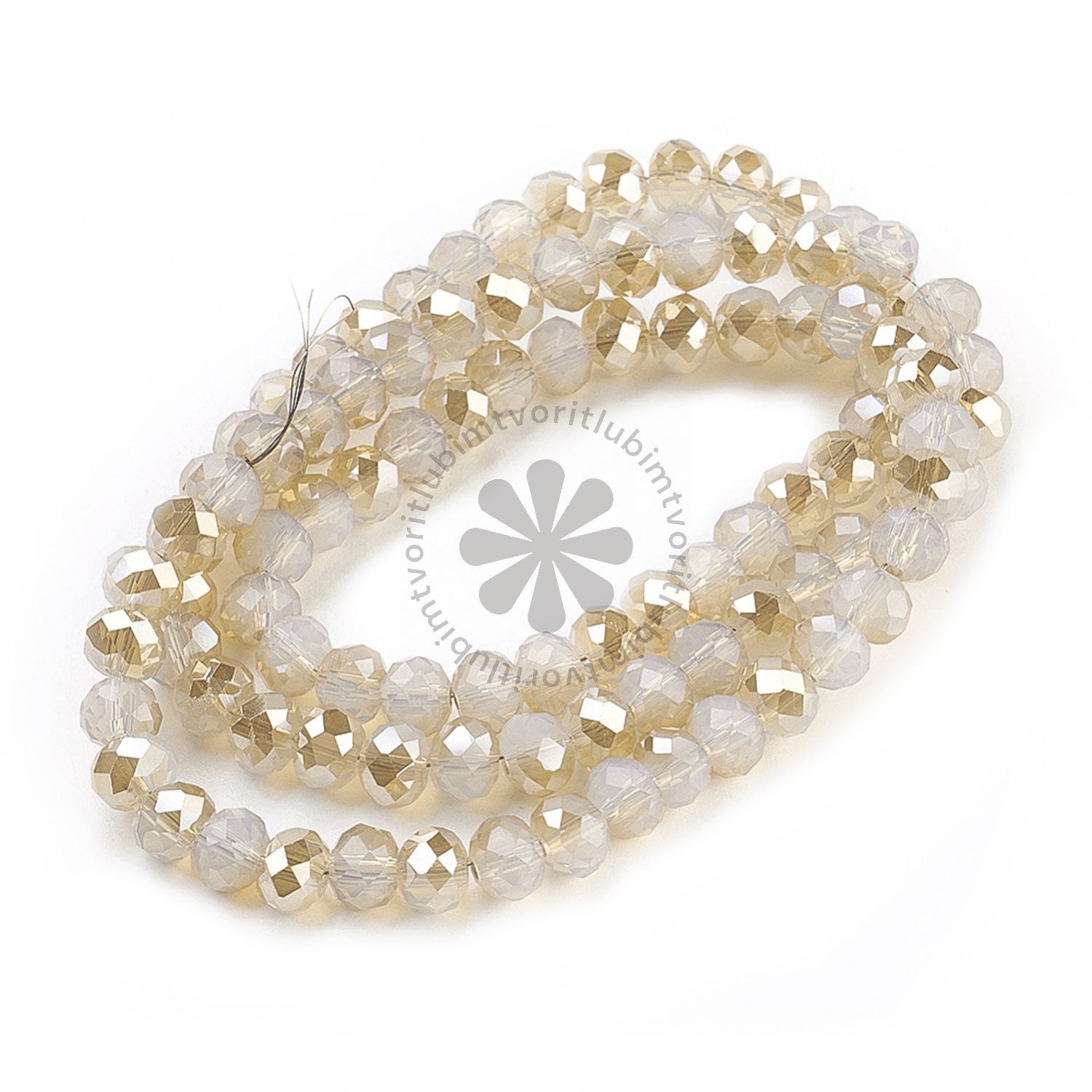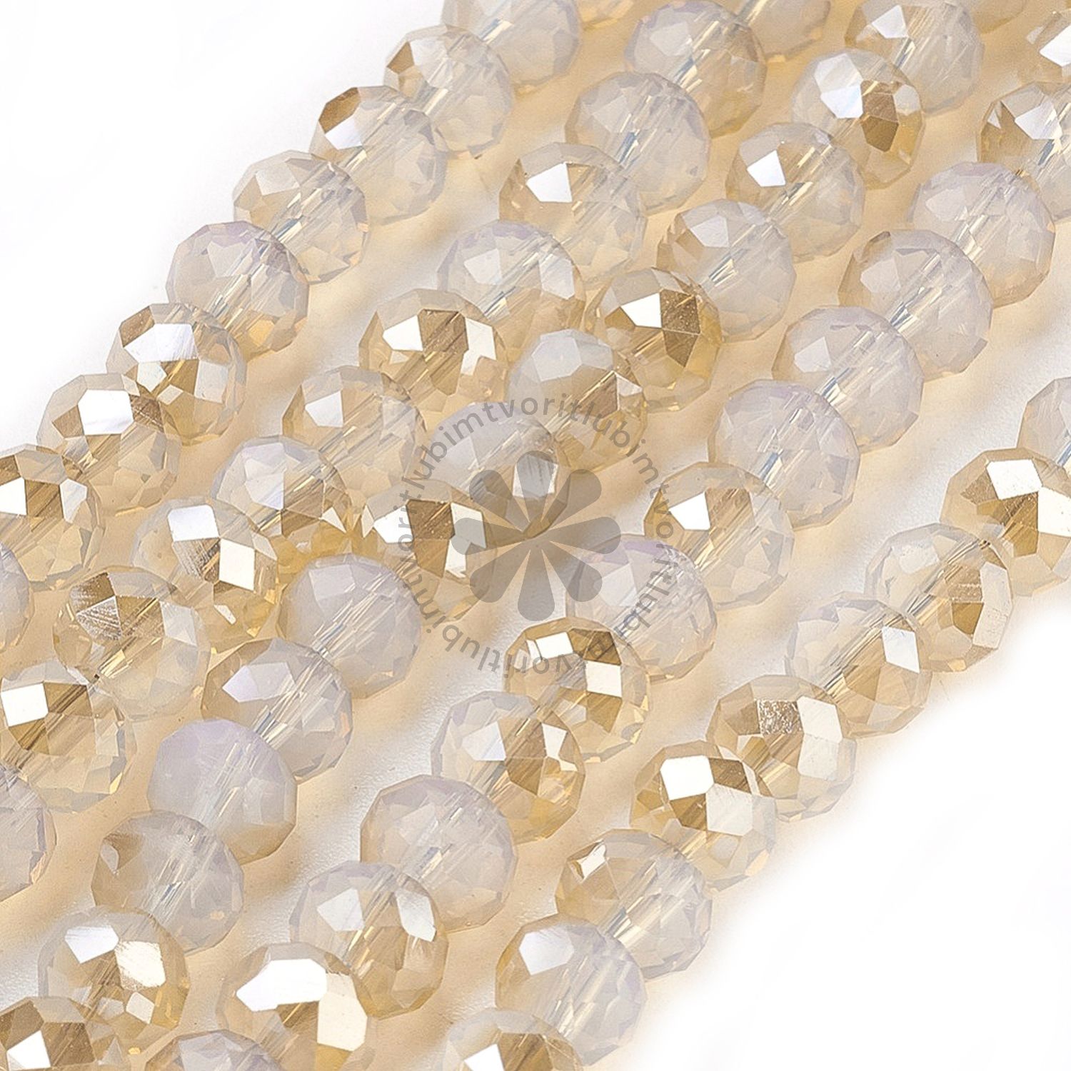 Elegantné sklenené korálky v tvare rondelle s jemným brúsením a polovičným dúhovým pokovovaním, ktoré im dodáva trblietavý a magický efekt. Ich ľanový odtieň pôsobí jemne a nadčasovo, ideálne na tvorbu náramkov, náhrdelníkov či náušníc s jemným, luxusným vzhľadom.