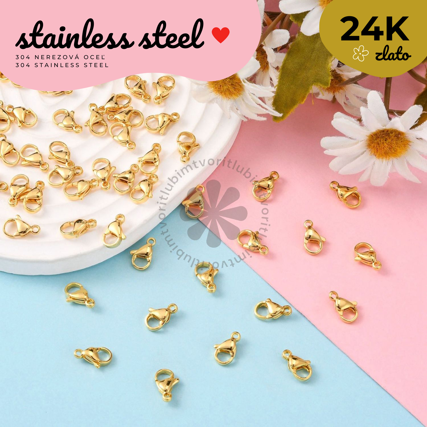 Elegantná karabínka z kvalitnej 304 nerezovej ocele s ručným leštením a povrchovou úpravou v pravom 24K zlate. S rozmerom 11x7 mm je ideálna pre výrobu náhrdelníkov, náramkov či iných šperkov.
