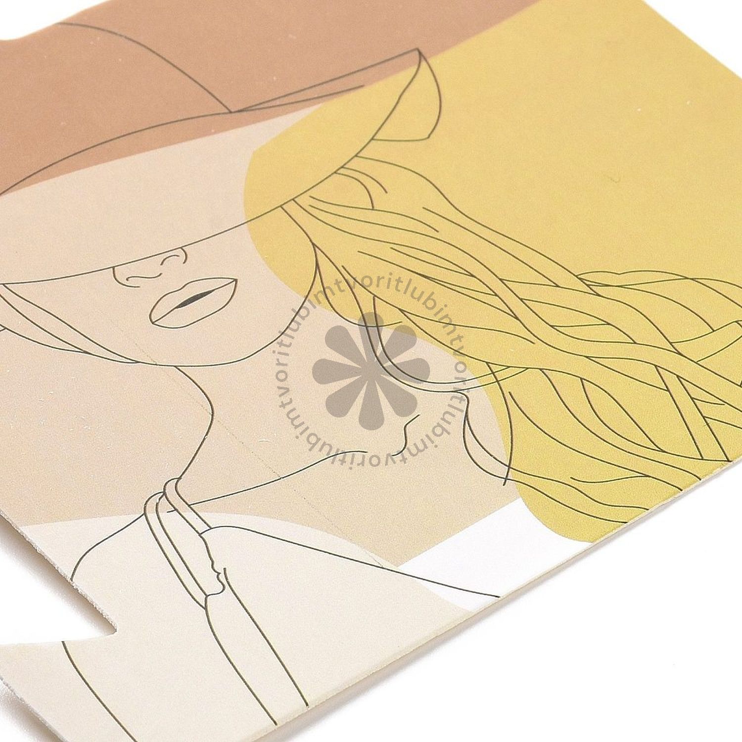 Svetlo-khaki papierové karty s ženským motívom, navrhnuté na elegantné prezentovanie náramkov, sponiek do vlasov či mašlí. Otvor umožňuje jednoduché zavesenie a praktické usporiadanie doplnkov.