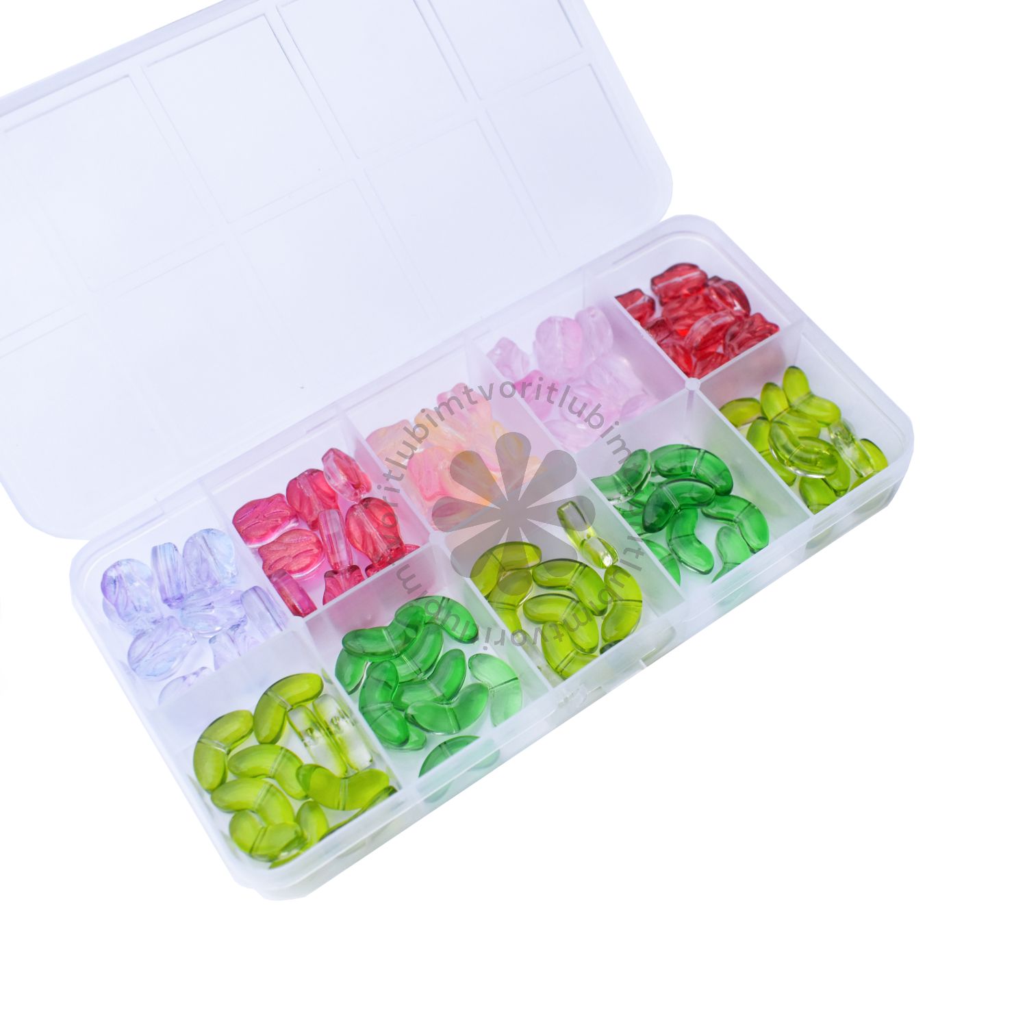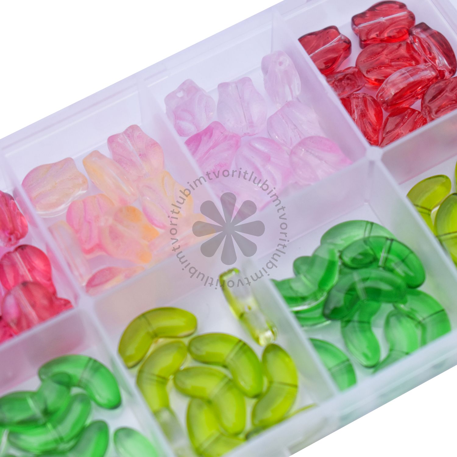 Plastová krabička s obľúbenými sklenenými korálkami v tvare tulipána. Krabička obsahuje 5 farieb kvetin s lístkami. Veľký mix koráliek CCB plastových koráliek v 4 farbách. CCB = Copper Coated Beads (pokované akrylové korálky). Perfektná voľba pre deti aj dospelých, vhodná aj ako kreatívny darček.