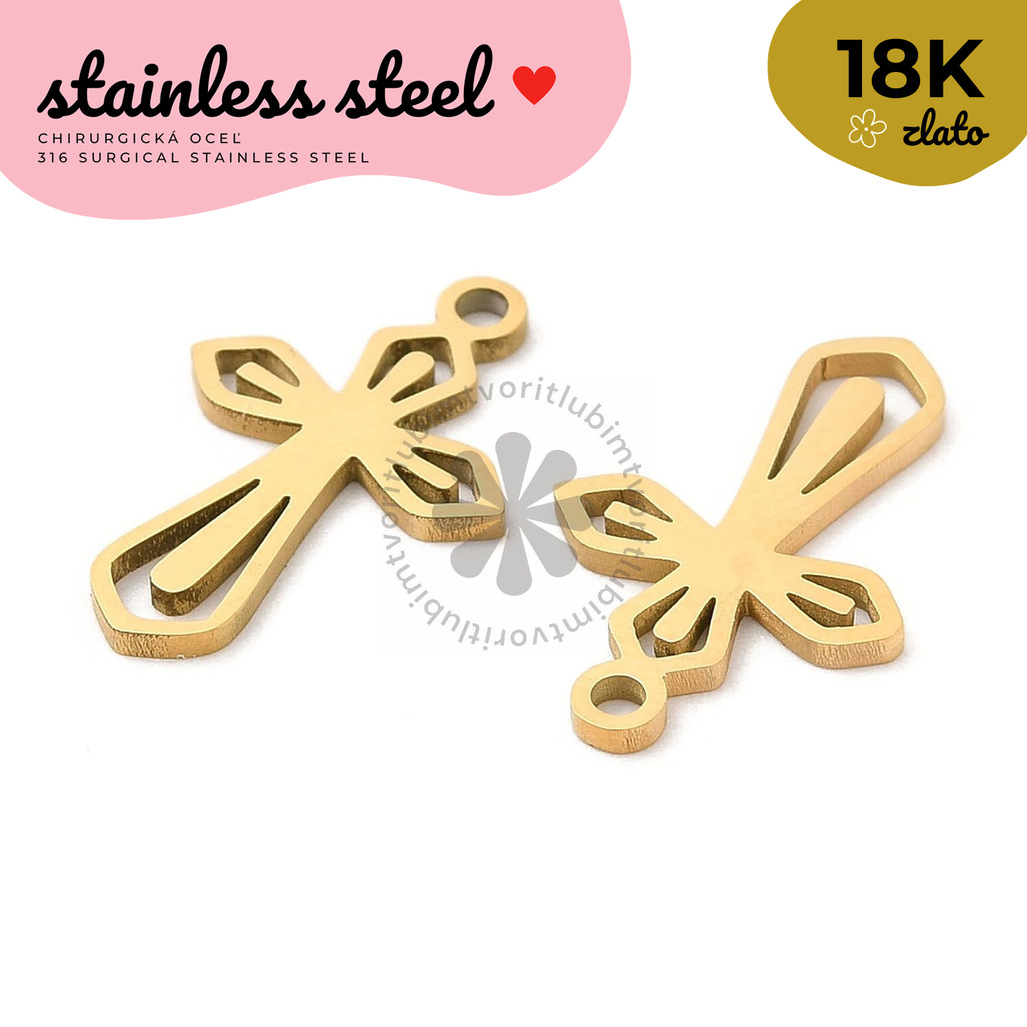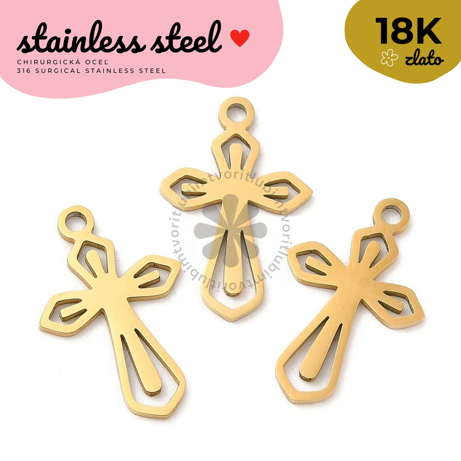 Kvalitný prívesok z chirurgickej ocele 316L, bez obsahu niklu, vyrezávaný laserom. Povrchová úprava s reálnym 18K pozlátením pomocou IP (Ion Plating) technológie zaručuje dlhodobý lesk a odolnosť. Ideálny na výrobu elegantných šperkov.