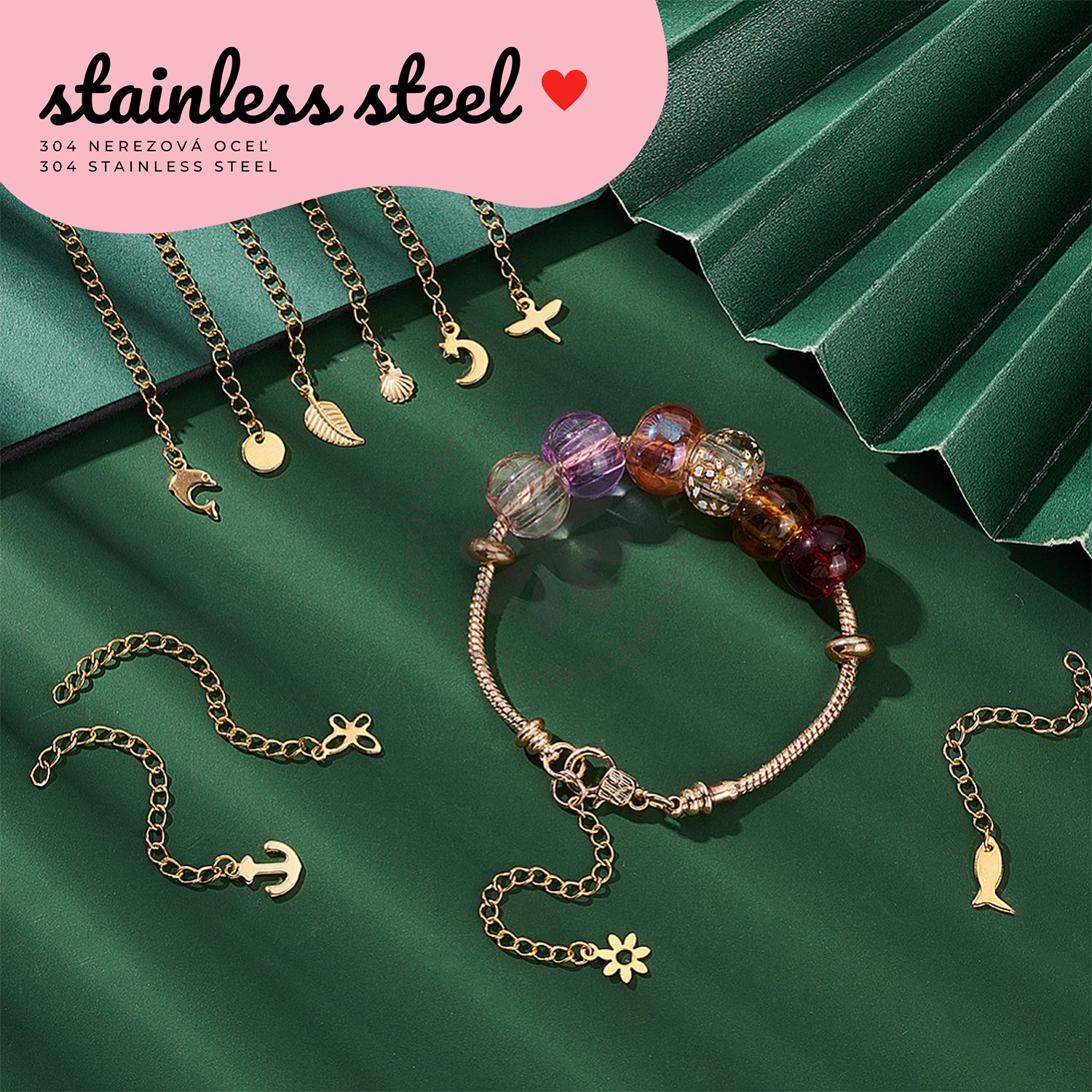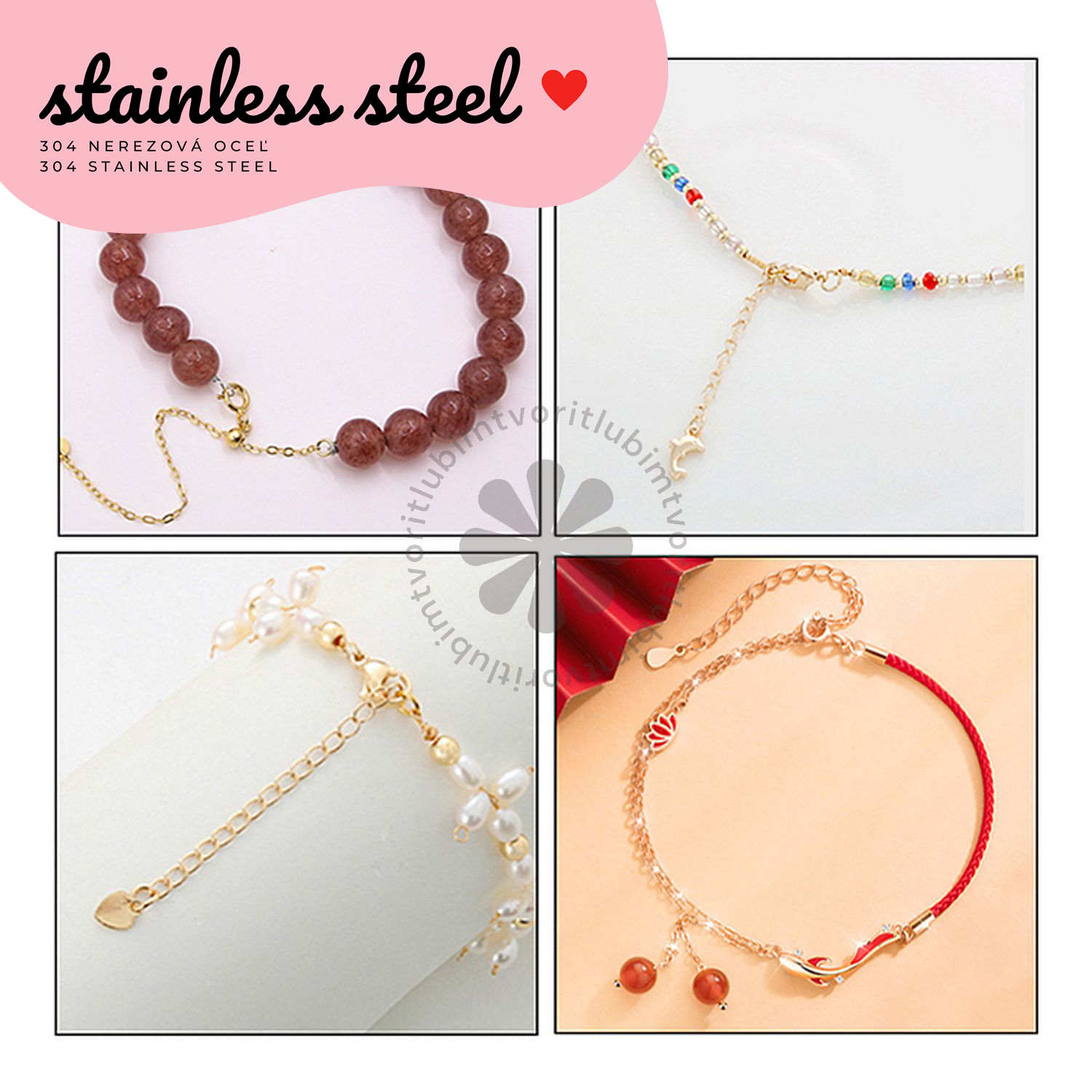 Predlžovacie retiazky z kvalitnej nerezovej ocele 304 v zlatej farbe. Vhodné na výrobu šperkov, ako praktické doplnky pri tvorbe náramkov, náhrdelníkov či iných handmade projektov. V balení nájdeš 10 štýlov.
