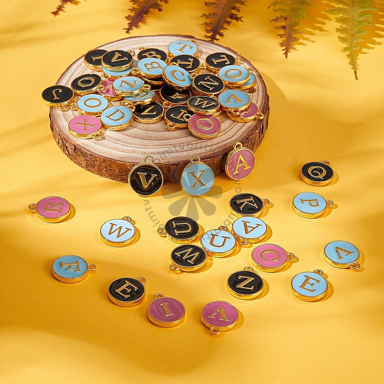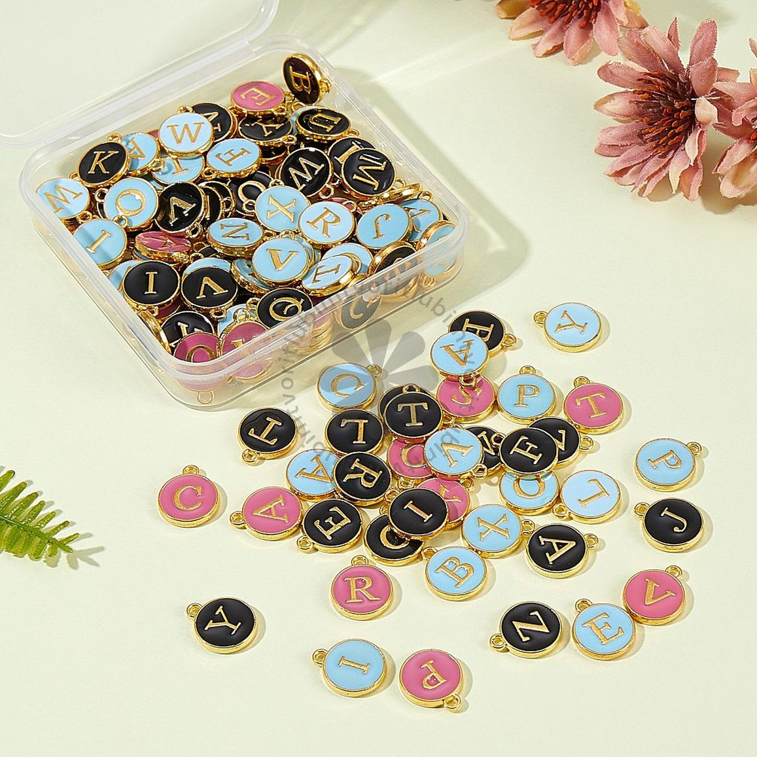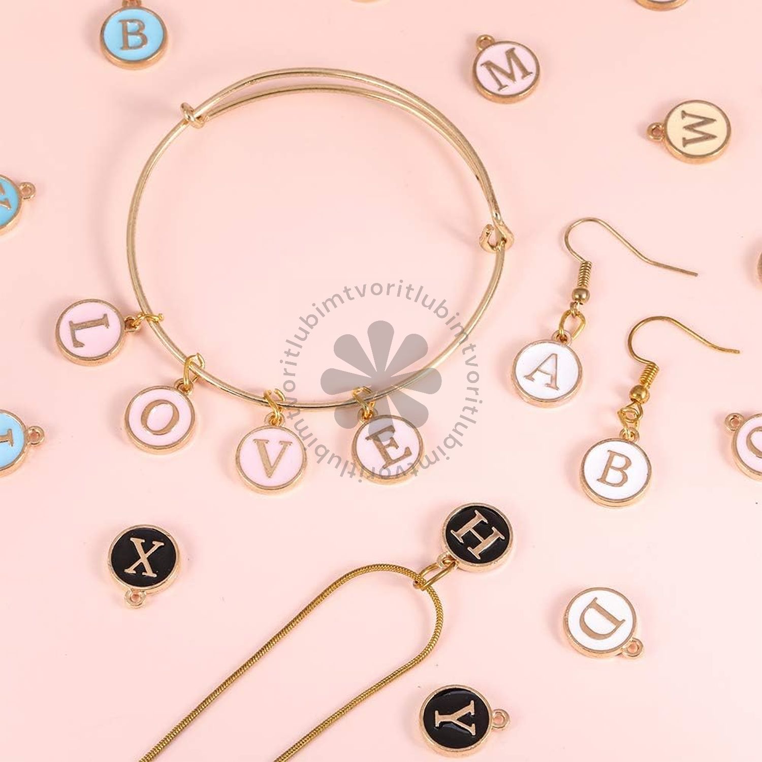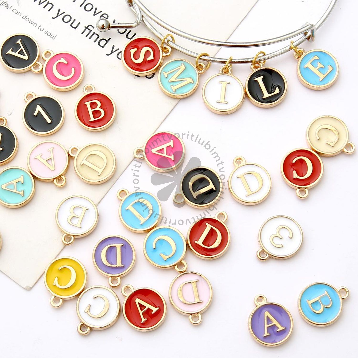 Sada 26 okrúhlych obojstranných príveskov so všetkými písmenami abecedy (A~Z), ideálna na vytváranie personalizovaných šperkov. Prívesky sú vyrobené zo zliatiny a zdobené farebným lakom pre štýlový vzhľad.