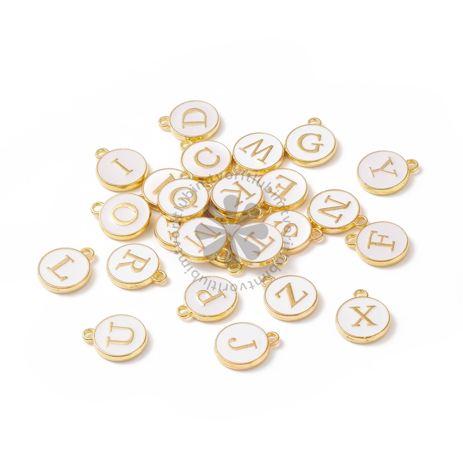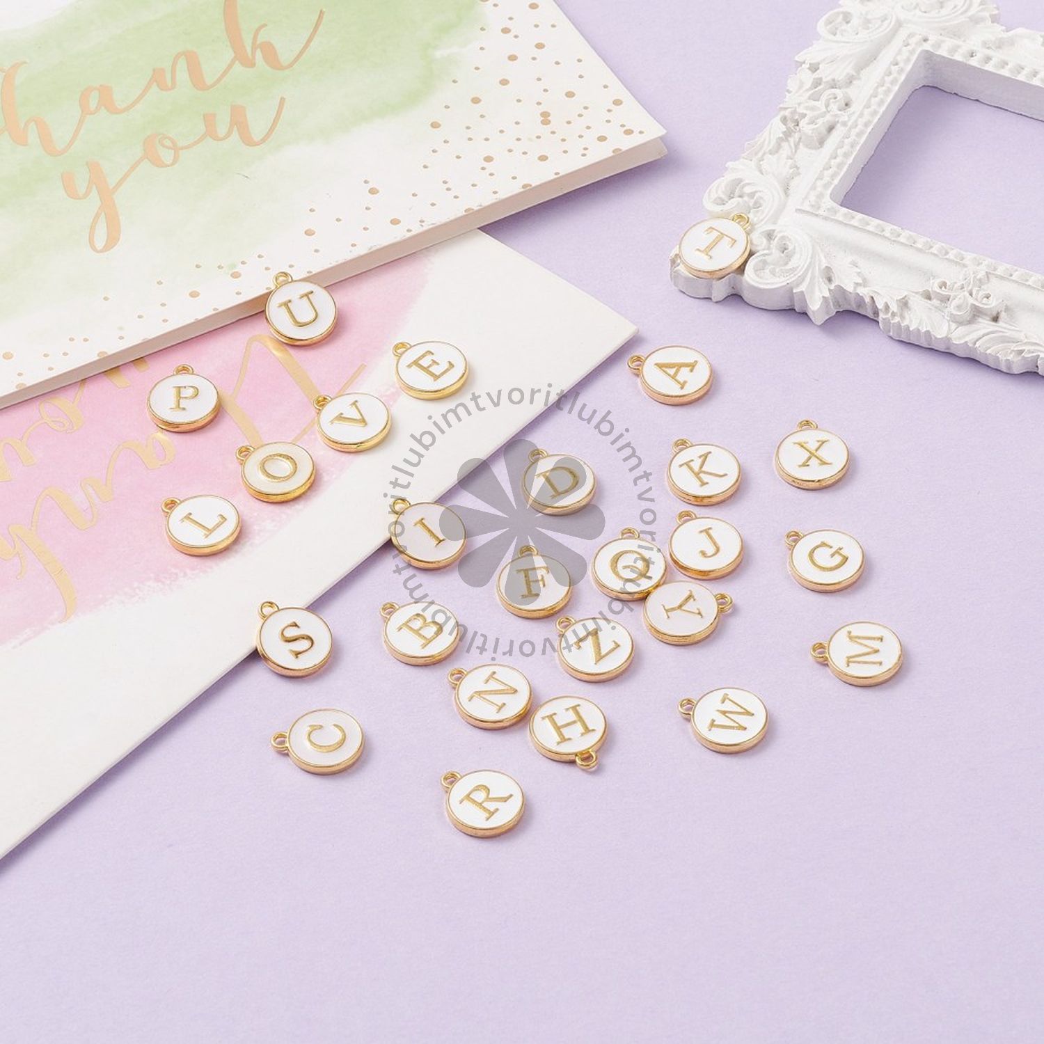 Sada 26 okrúhlych obojstranných príveskov so všetkými písmenami abecedy (A~Z), ideálna na vytváranie personalizovaných šperkov. Prívesky sú vyrobené zo zliatiny a zdobené farebným lakom pre štýlový vzhľad.