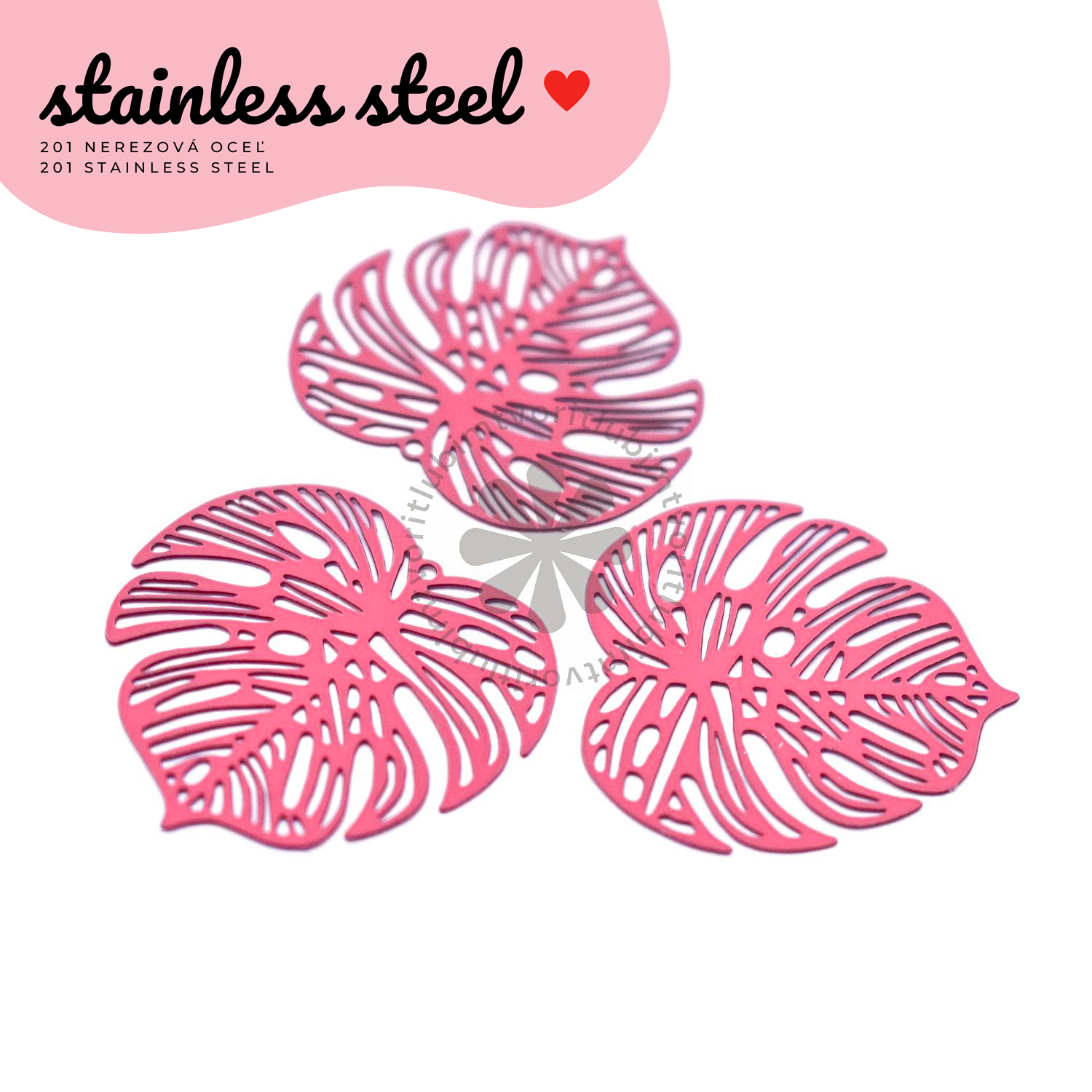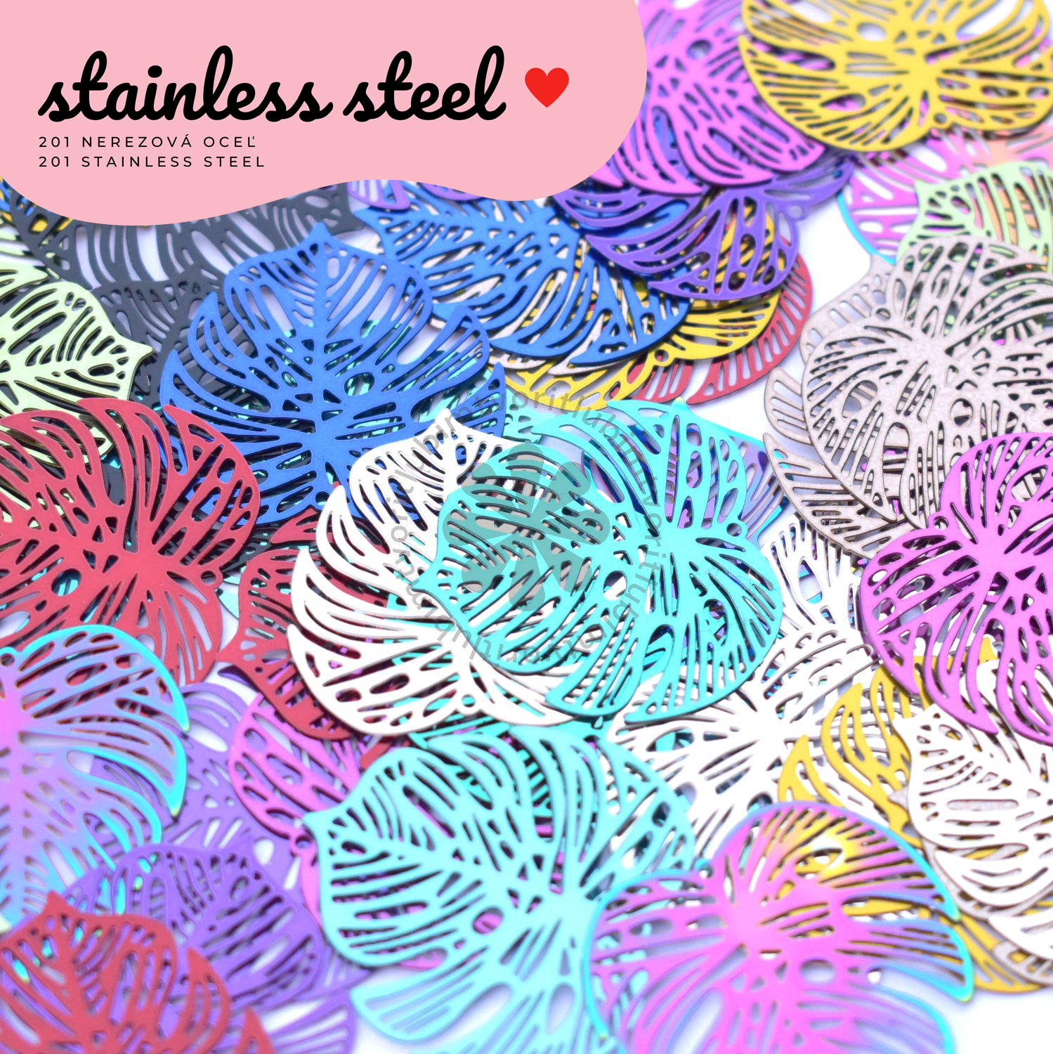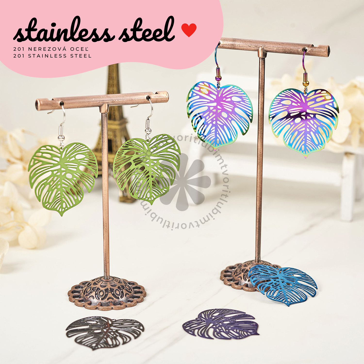 Prívesok z kvalitnej 201 nerezovej ocele s jemným rytím a motívmi tropických listov – monstera. Vďaka detailnému spracovaniu a ľahkej konštrukcii sa skvele hodí na výrobu náušníc, náramkov alebo letných príveskov.