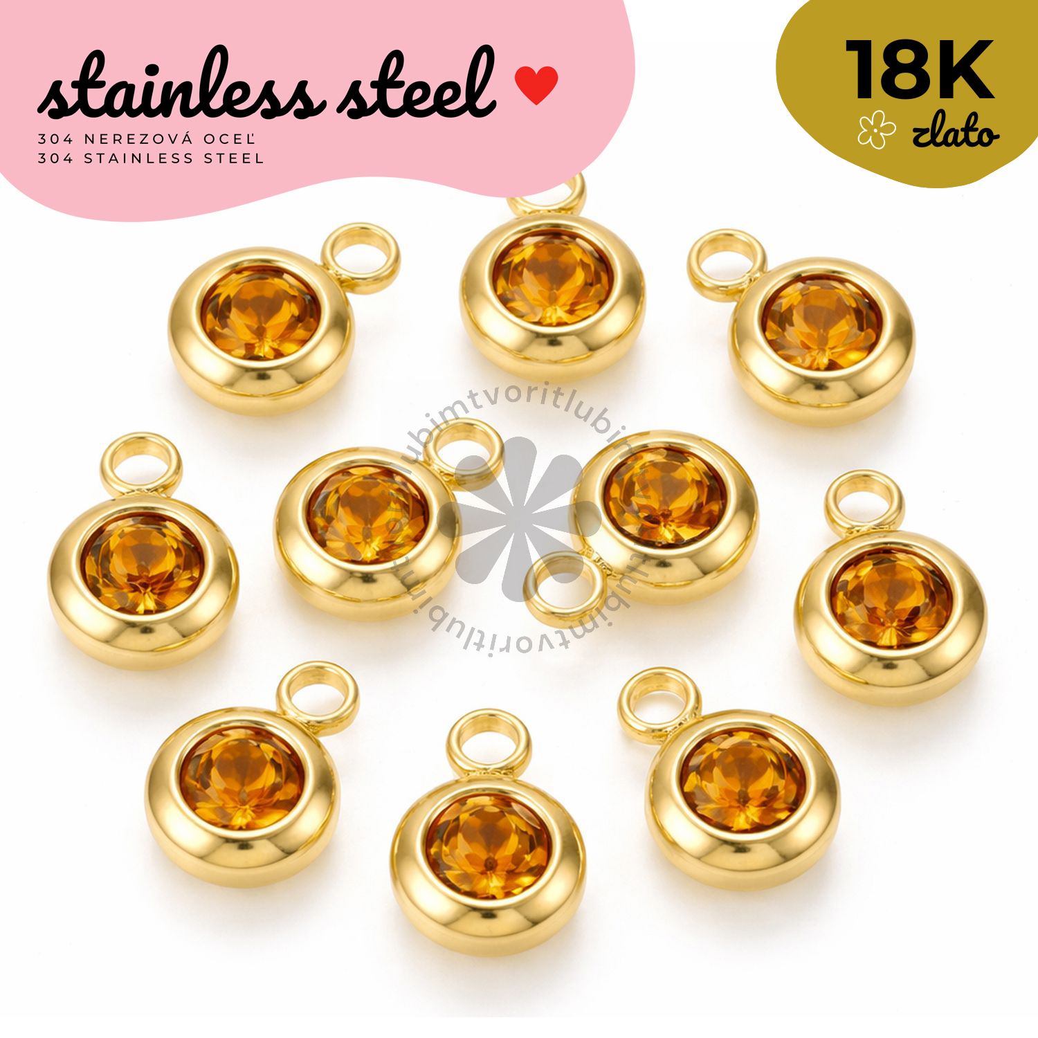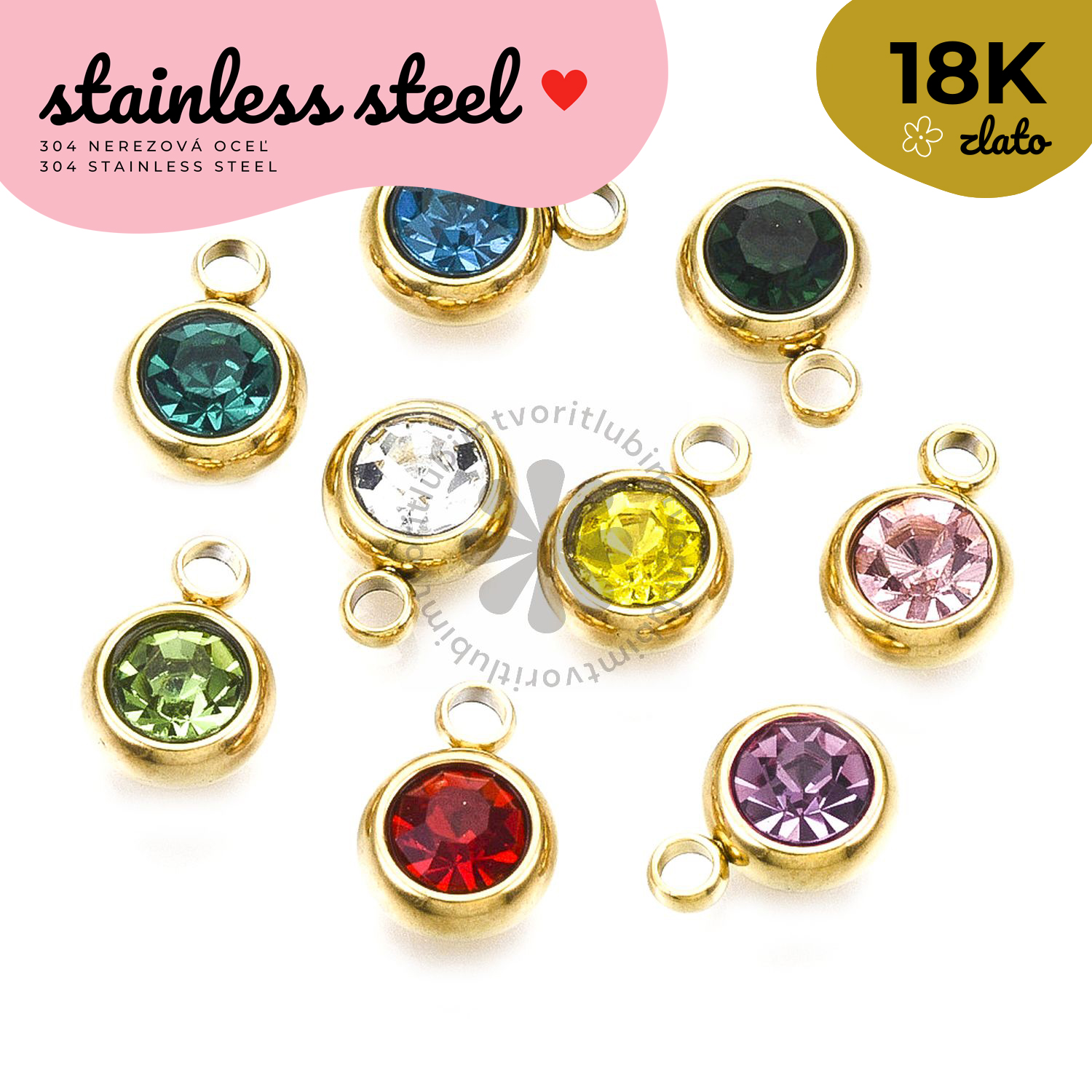 Prívesky z 304 nerezovej ocele pozlatená 18K zlatom so zirkónom v tvare plochého kruhu pôsobia elegantne a jemne. Pridaný kryštál dodáva šperkom výrazný lesk a farebný akcent. Vďaka nerezovej oceli sú prívesky odolné a dlho si zachovajú svoj vzhľad.