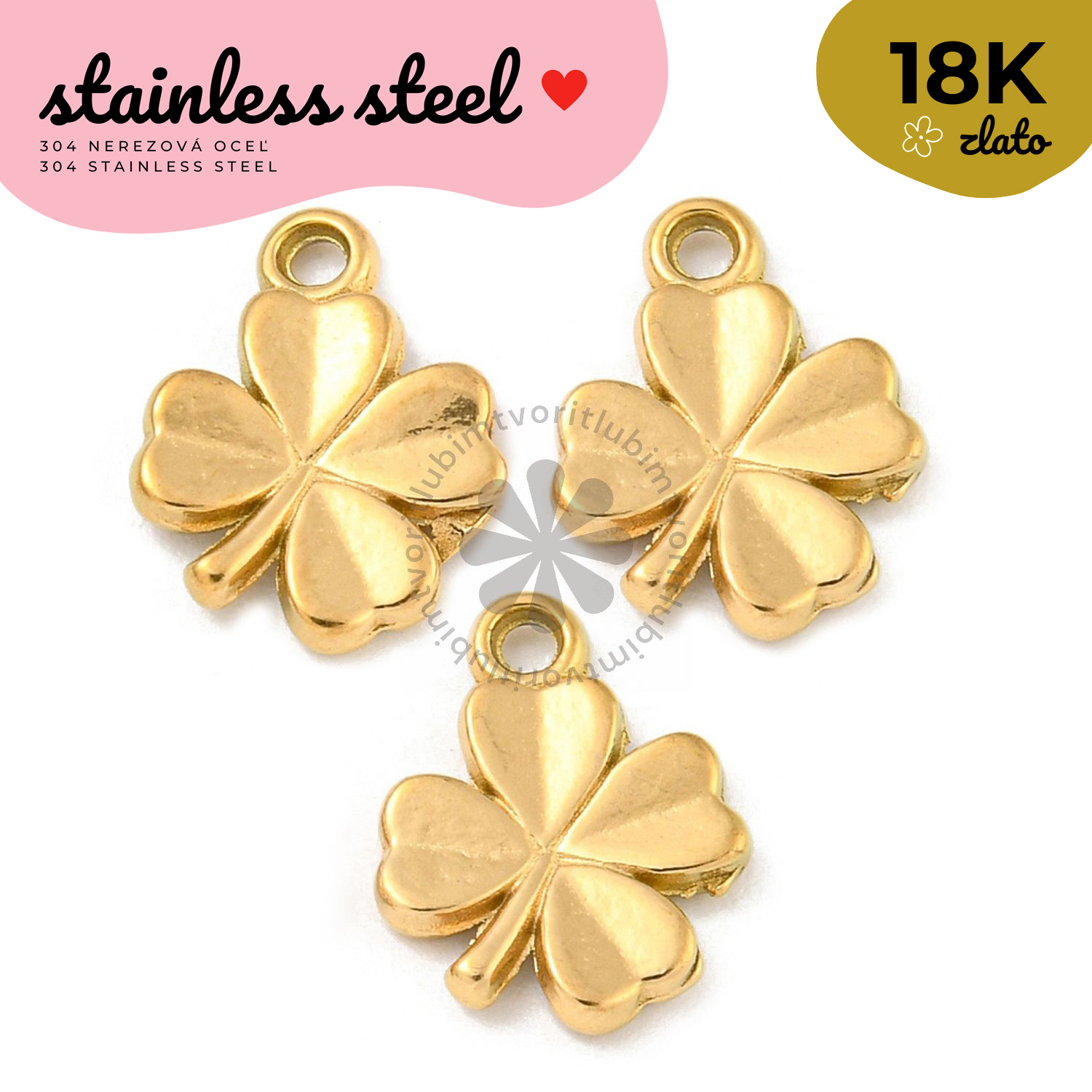 Prívesky zo 304 nerezovej ocele s IP povrchovou úpravou v tvare štvorlístka sú pokovované skutočným 18K zlatom, odolné proti stmavnutiu a majú trvácny lesklý vzhľad. Symbol šťastia robí tieto prívesky ideálnymi na elegantné a personalizované šperky.