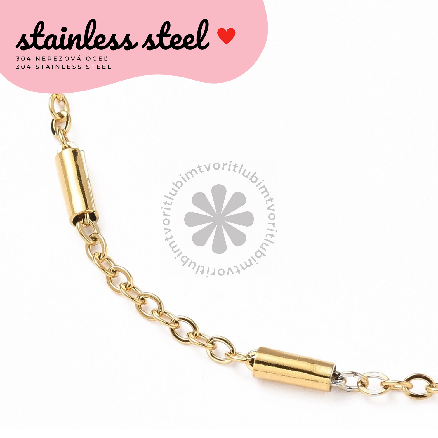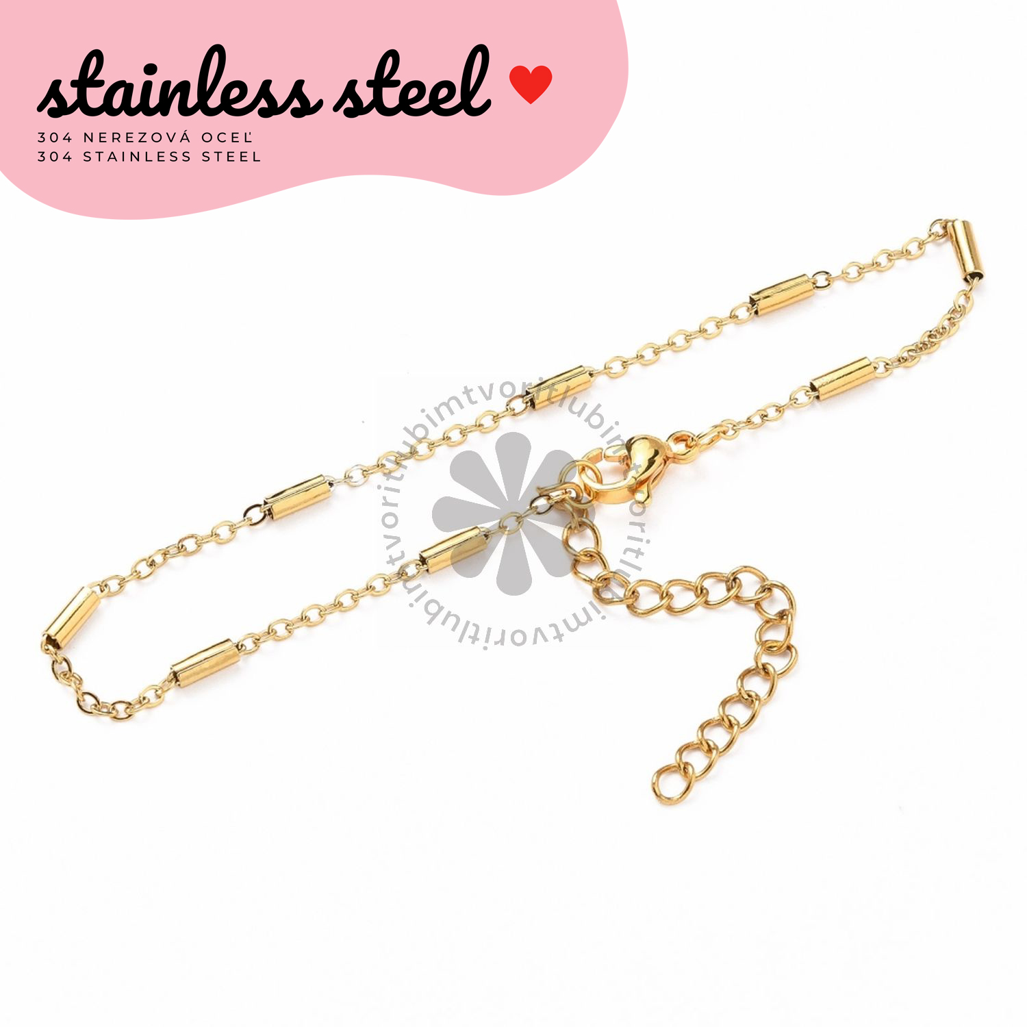 Štýlový náramok zlatej farby z nehrdzavejúcej ocele 304 s moderným dizajnom a tubusovými korálkami. Povrchová úprava pomocou ion platingu (IP), ktorý je súčasťou procesu PVD (Physical Vapor Deposition), zaručuje vysokú odolnosť voči oderu, poškriabaniu a černeniu. Náramok si tak dlhodobo zachová svoj lesk a sýtu farbu a je vhodný na každodenné nosenie pre ženy aj mužov.
