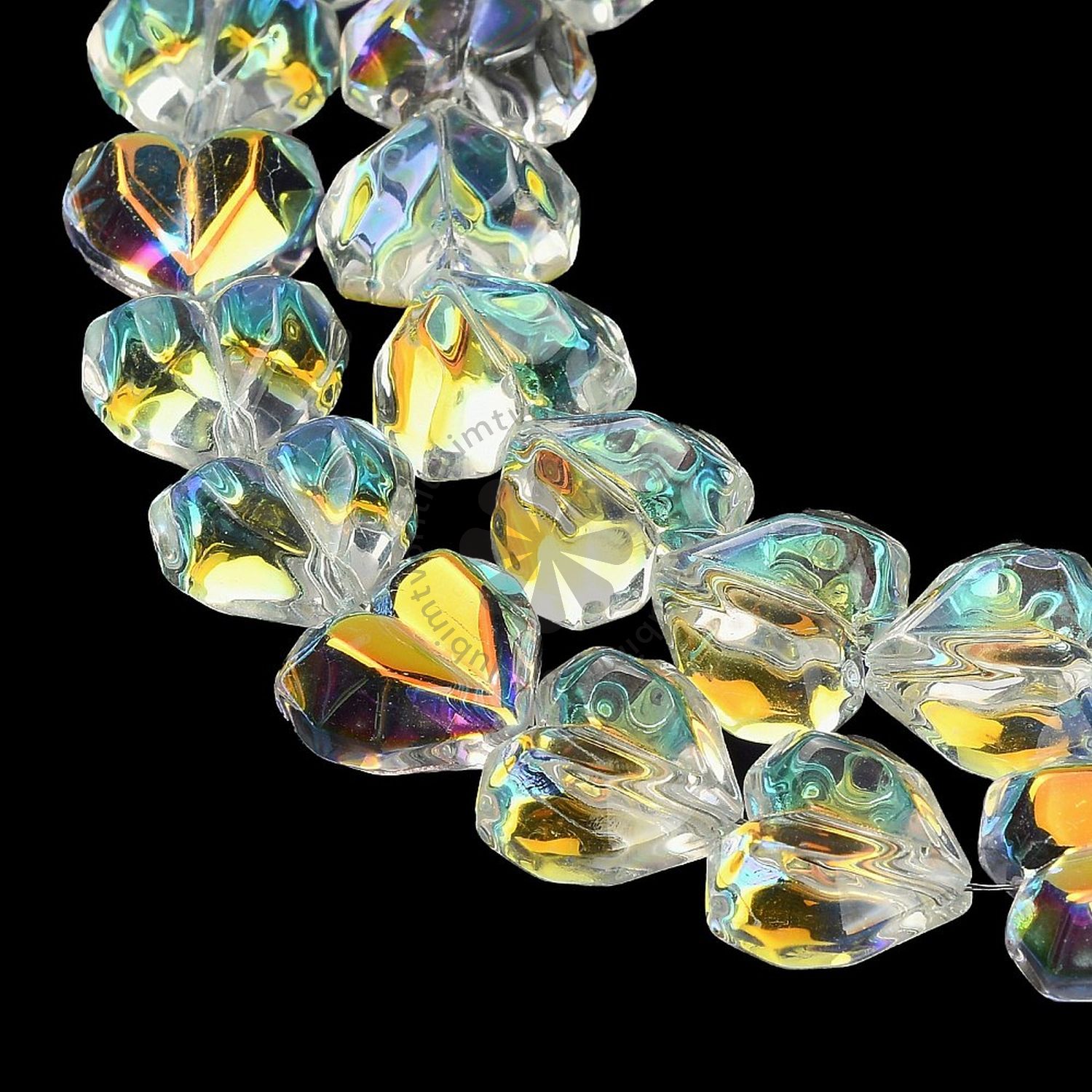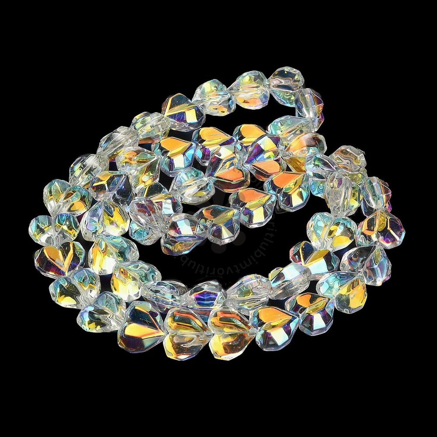 Priehľadné srdiečkové sklenené korálky s jemným fasetovaným povrchom a čiastočným AB (Aurora Borealis) pokovením dodávajú šperkom jemný dúhový lesk a eleganciu. Ideálne na výrobu náhrdelníkov, náramkov alebo náušníc s romantickým nádychom.
