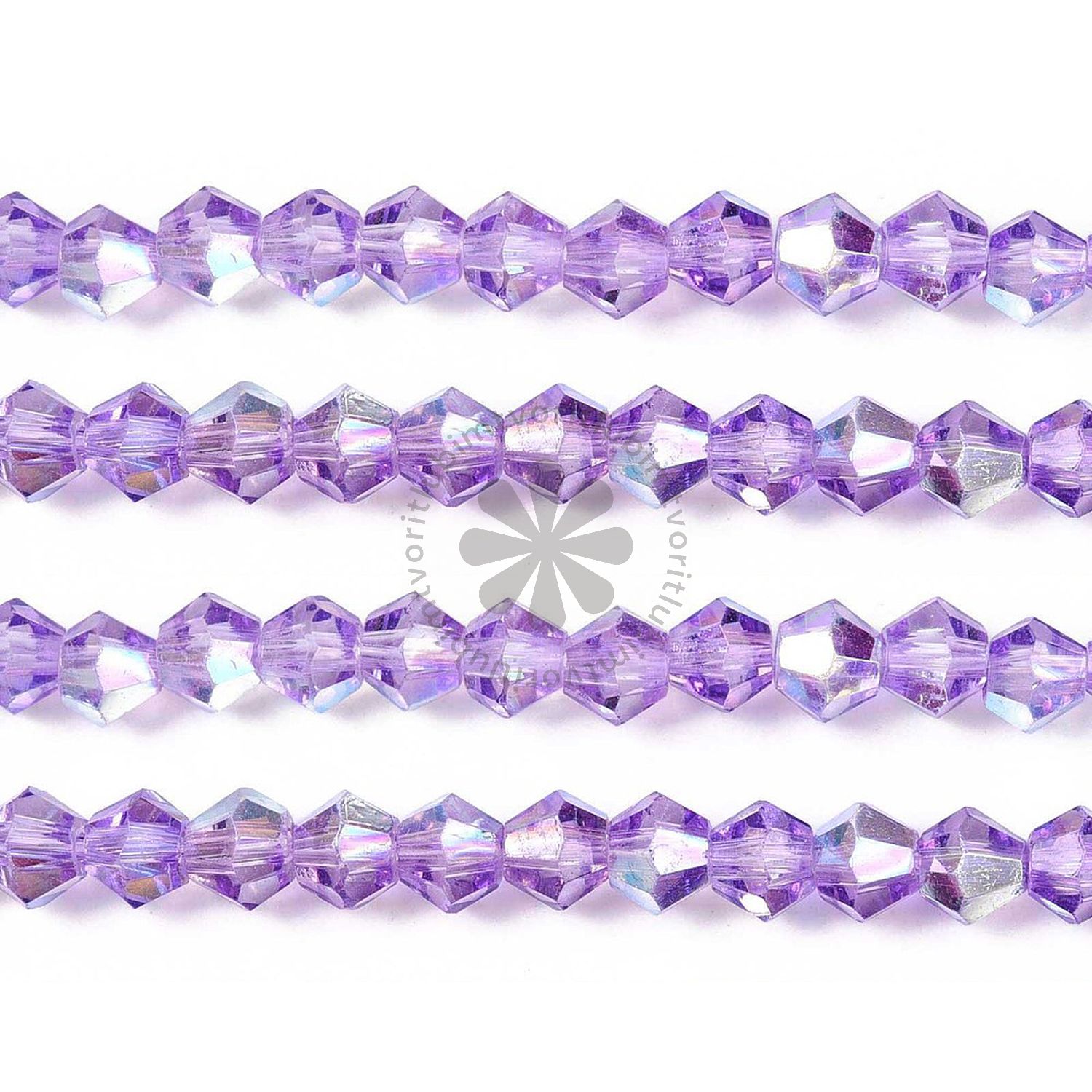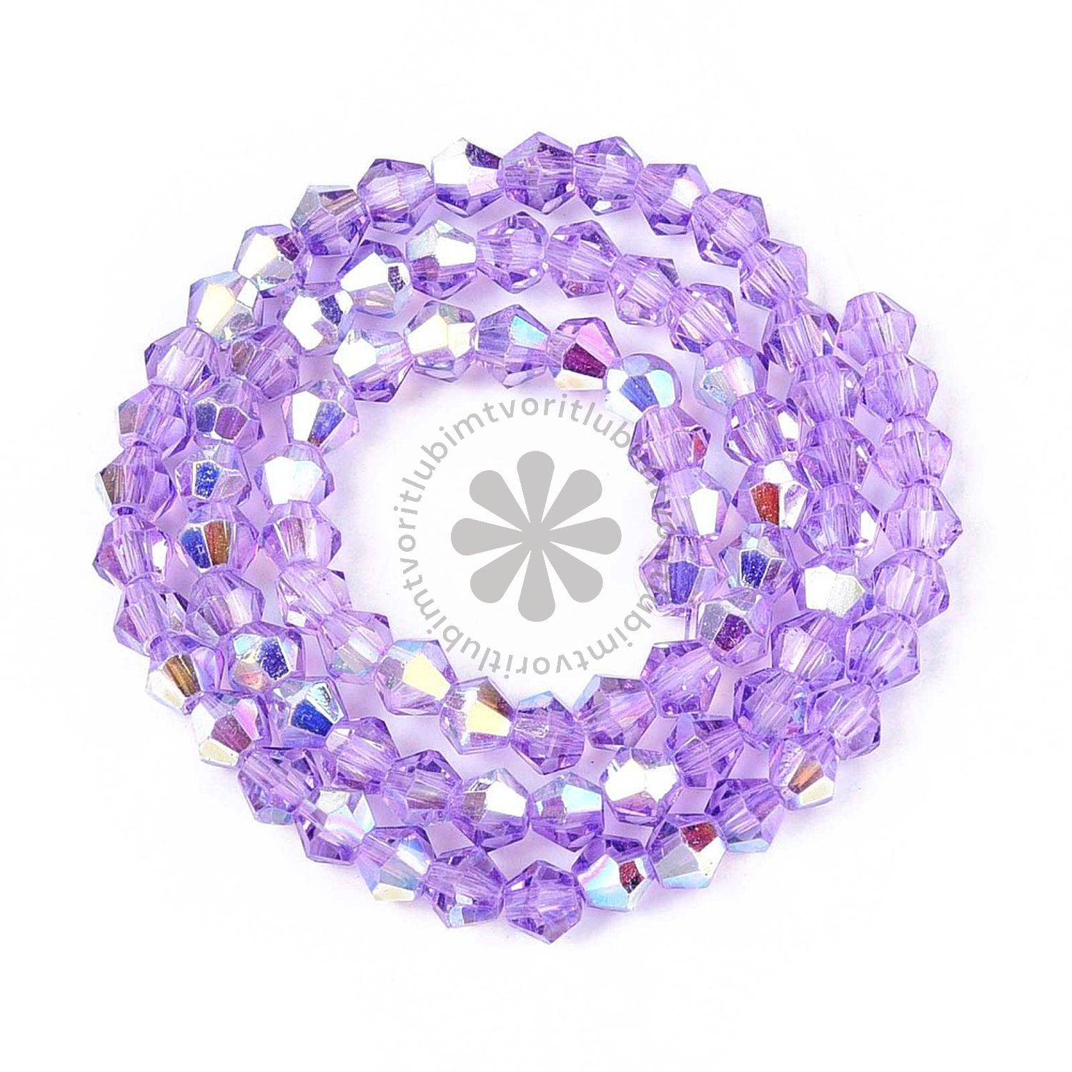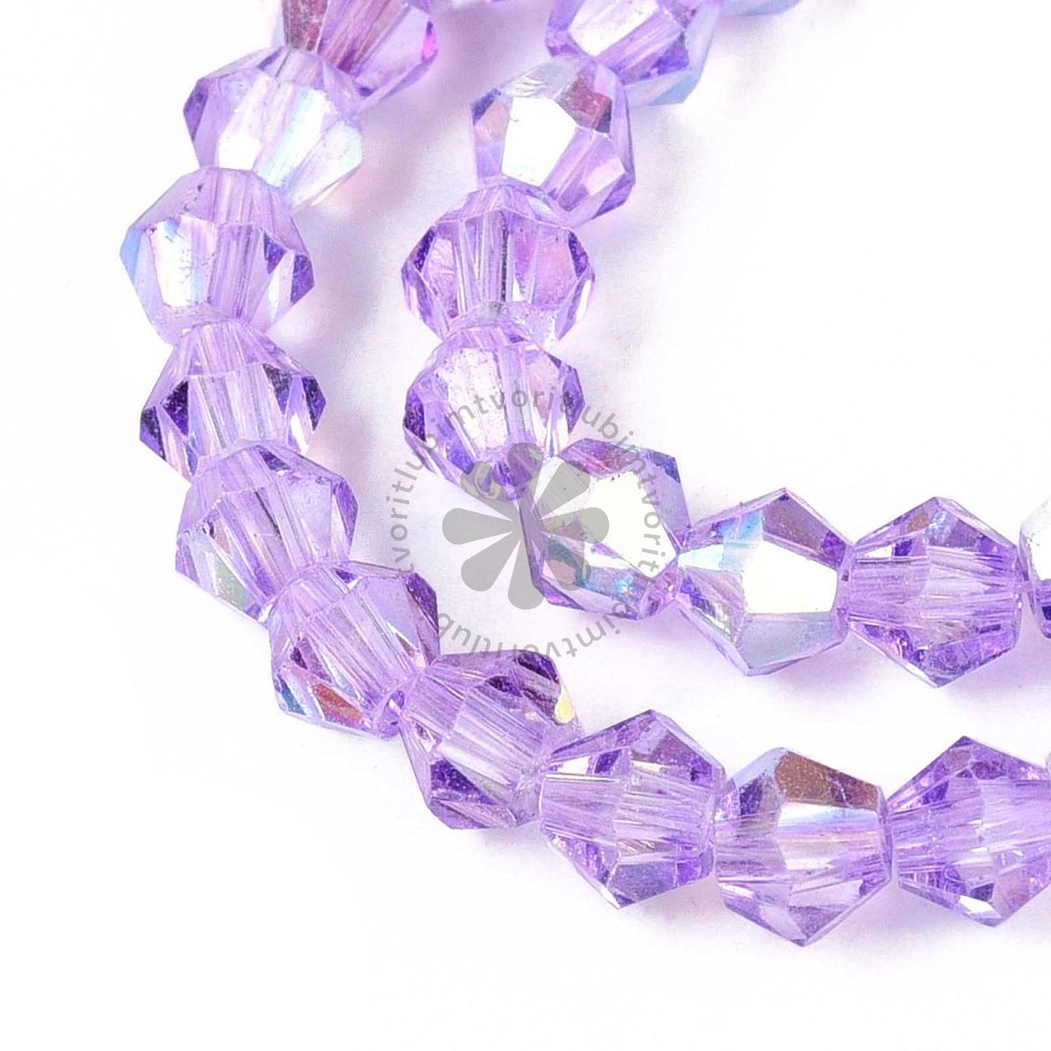 Priehľadné sklenené korálky v tvare bikónu, čiastočne pokovované AB efektom pre jemný dúhový lesk. Farbené a tepelne upravené, ideálne na výrobu náramkov, náhrdelníkov a iných originálnych šperkov.