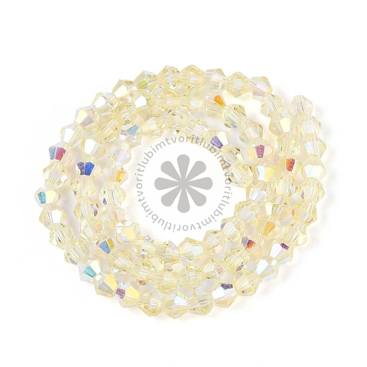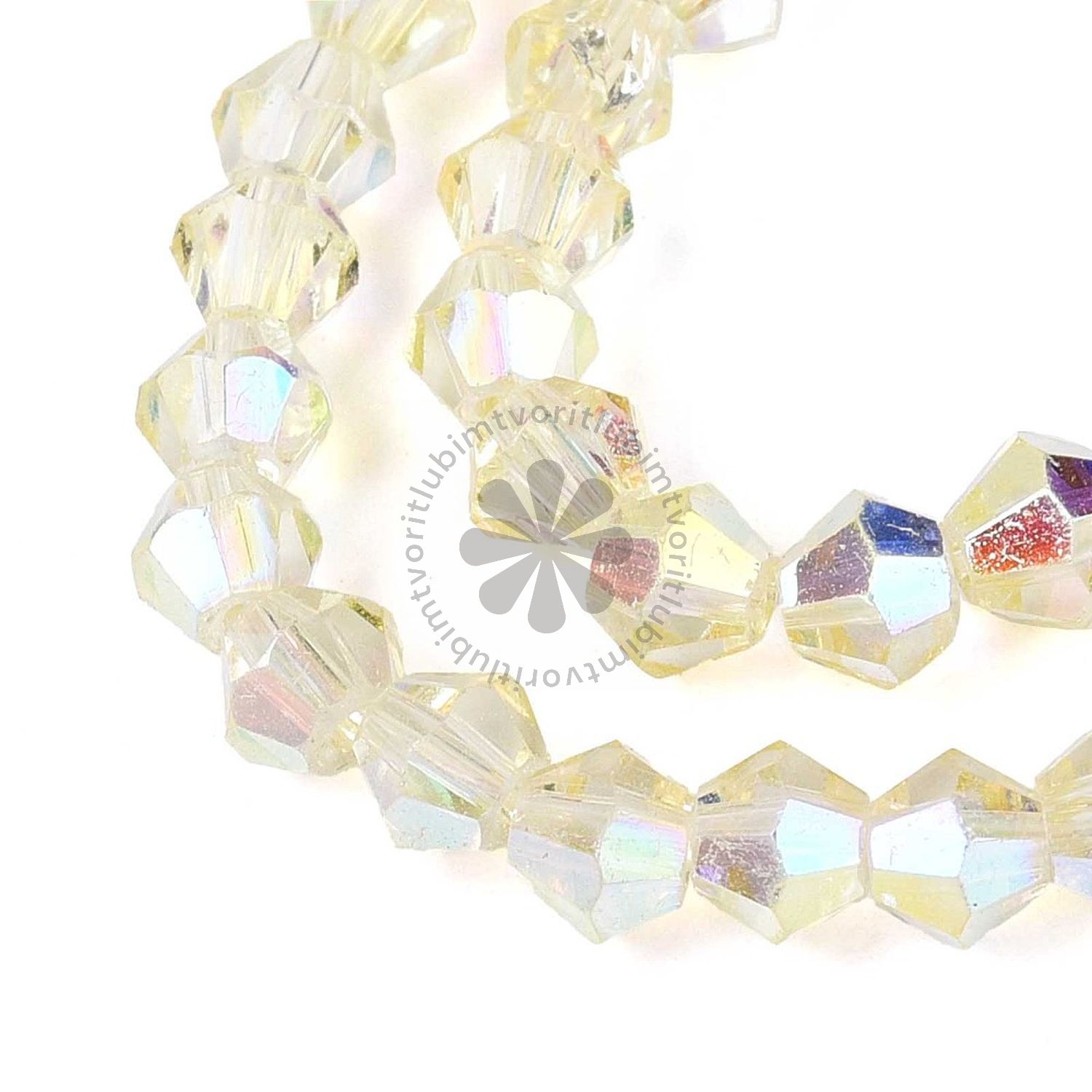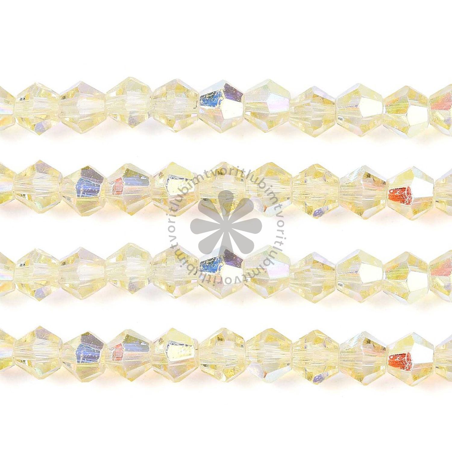 Priehľadné sklenené korálky v tvare bikónu, čiastočne pokovované AB efektom pre jemný dúhový lesk. Farbené a tepelne upravené, ideálne na výrobu náramkov, náhrdelníkov a iných originálnych šperkov.