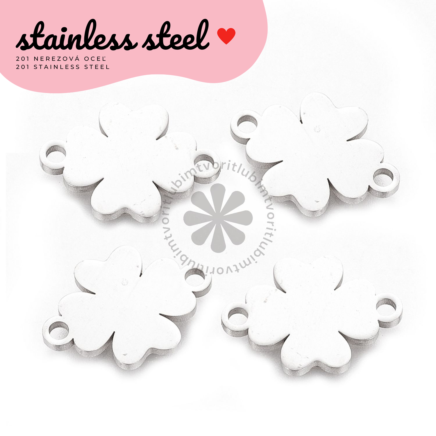 Elegantný spojovací komponent v tvare štvorlístka z kvalitnej nehrdzavejúcej ocele 201, ktorá je odolná voči černeniu (tarnish resistant). Vhodný ako medzikus do náramkov, náhrdelníkov alebo náušníc.